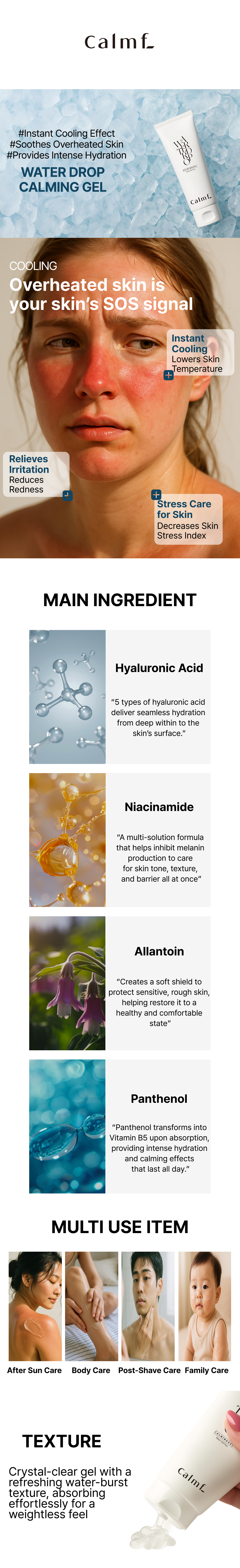 Waterdrop-to-moisture care : Refreshing gel texture transforms into waterdrop-like moisture beads, instantly cooling and hydrating heated skin